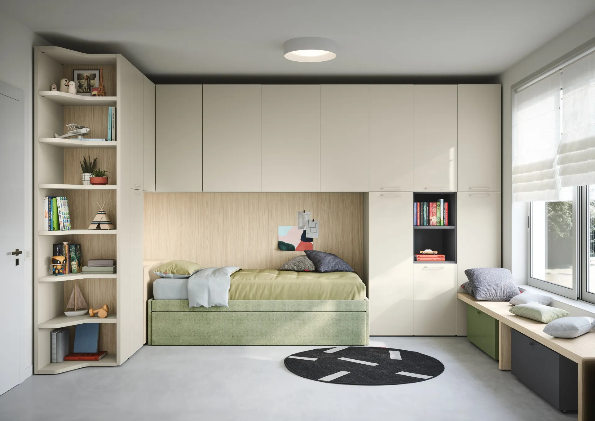 Porta contenuto estetico e cromie vivaci nella stanza dedicata ai più piccoli con questa proposta, una delle Camerette a ponte per ragazzi di Nidi. Questa soluzione in melaminico ultima ottimamente le doti pratiche e l'estetica della camaretta, poiché è capace di coniugare ergonomia e sicurezza. Nella progettazione della stanza dei bambini affidati a noi: nel nostro showroom presentiamo tutte le più esclusive composizioni arredative moderne per la loro camera. Nidi dispone di una ricca gamma di elementi accessori da comporre su misura: troverai letto, armadio, scrivania, sedie e librerie.