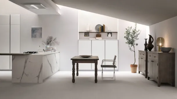 La grande modularità offerta da Evolution System si declina, nel modello di cucina Aliant, in diverse soluzioni progettuali, valorizzate da una nuova gamma di materiali tutti da scoprire.